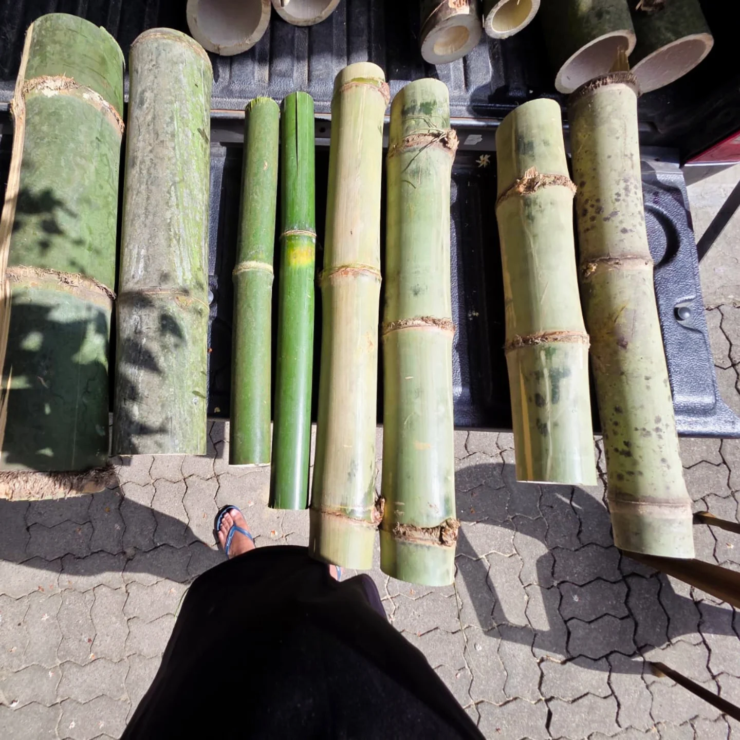 Material sourcing, selection and natural treatment of bamboo (species-specific harvesting; water immersion or chemical treatment for durability)